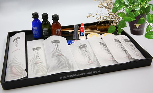 Đối với các vật dụng ở phòng tắm thì được sắp xếp gọn gàng vào khay đựng. Còn một số đồ dùng khác được để riêng trong hộp, túi ni lông, bao bì in tên, logo khách sạn.