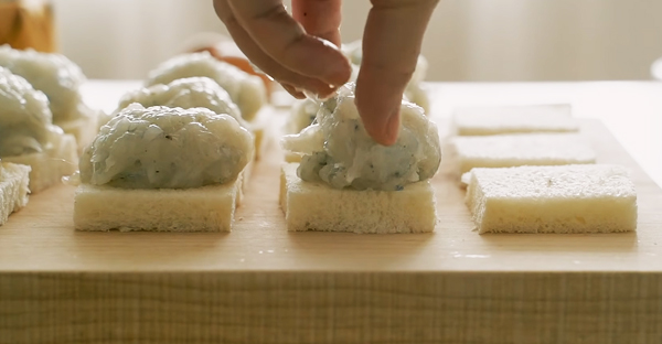 - Cho một lượng tôm vừa đủ vào miếng bánh mì, đặt thêm một miếng bánh mì nửa lên mặt, kẹp tôm ở giữa. Dùng tay ép nhẹ cho bánh mì dính vào tôm. Thực hiện lần lượt đến hết nguyên liệu.