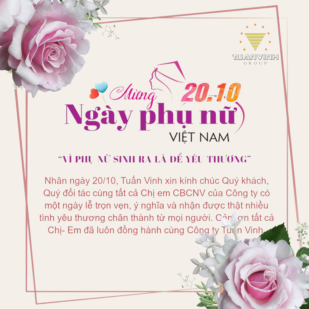 Nhân ngày 20/10, Tuấn Vinh xin gửi tới Quý khách hàng, Quý đối tác cùng tất cả Chị em CBCNV của công ty những lời chúc tốt đẹp nhất. Chúc quý khách có một ngày lễ thật đặt biệt và ý nghĩa. Cảm ơn chân thành đến Quý khách hàng, Quý đối tác cùng tất cả Chị em CBCNV vì đã đồng hành cùng công ty chúng tôi trong suốt thời gian qua.